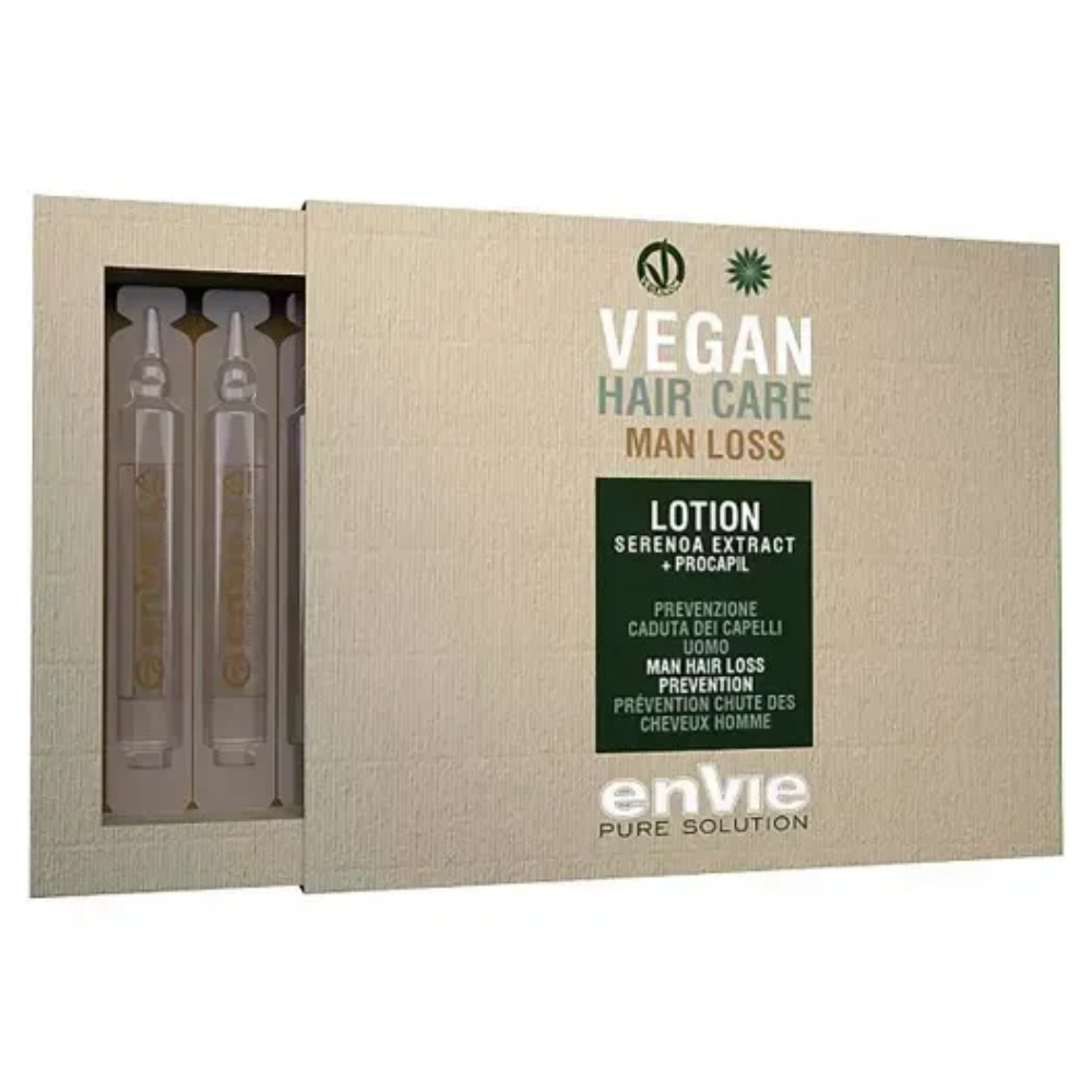 Лосьйон активуючий для кореня волосся чоловічий Envie Vegan Hair Care Man Loss Lotion (ампули 8×10): Радикальне рішення для активації росту волосся у чоловіків. Procapil (біотиноїл трипептид-1) уповільнює старіння, стимулює метаболічні процеси, збільшує частку волосся в фазі анагену. Зміцнює коріння та прискорює ріст. Веганська формула.