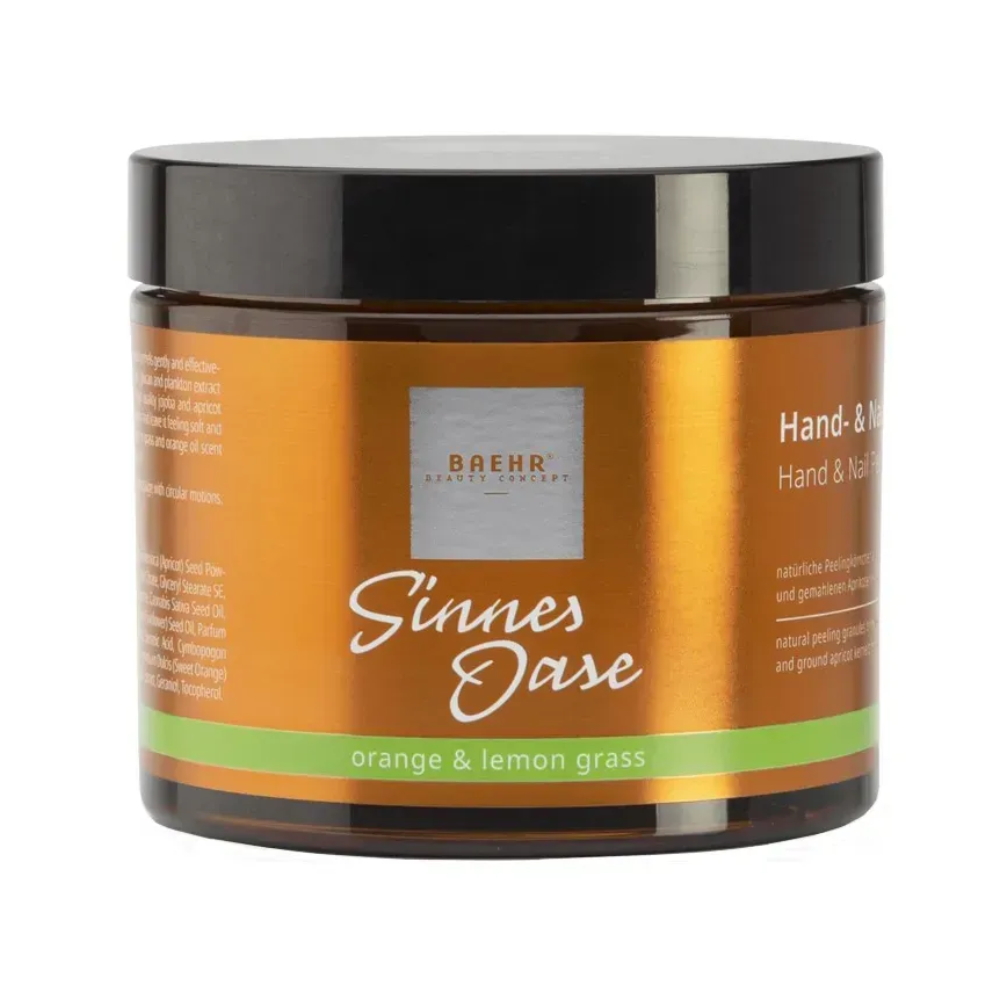 Відкрийте для себе делікатне оновлення шкіри рук та нігтів! Пілінг Baehr Sinnes Oase ефективно видаляє ороговілий шар, надаючи шкірі м’якості та гладкості. Активні інгредієнти — подрібнені абрикосові кісточки та целюлоза — забезпечують дбайливе відлущування. Комплекс олій абрикоса, коноплі та жожоба інтенсивно зволожує та робить шкіру еластичною. Екстракт планктону з бета-глюканом стимулює регенерацію і повертає рукам здоровий, доглянутий вигляд. Регулярне застосування робить шкіру шовковистою, еластичною та допомагає підтримувати доглянутий вигляд нігтів. Зроблено в Німеччині.