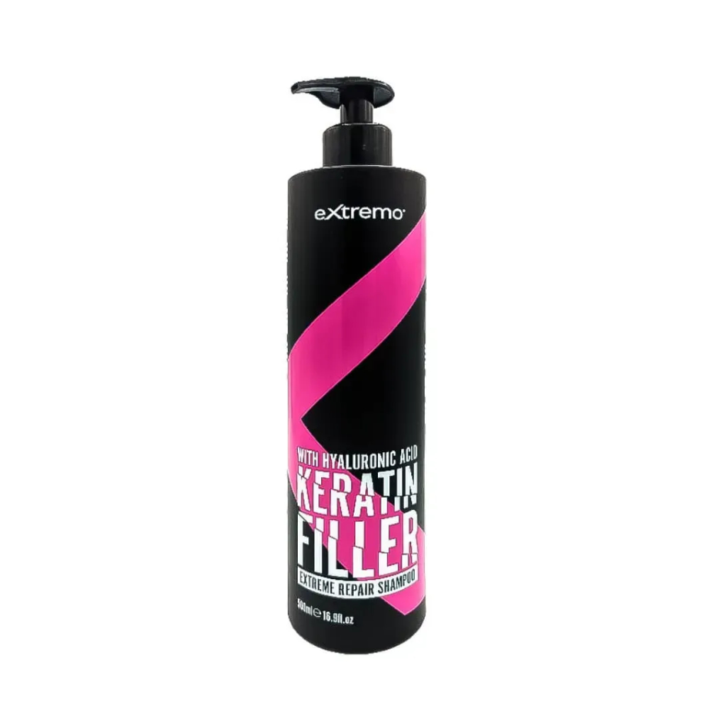 Шампунь для відновлення волосся Extremo Keratin Filler Repair Shampoo з кератином та гіалуроновою кислотою (500 мл): подаруйте вашому тонкому, ламкому та пошкодженому волоссю інтенсивну реструктуризацію! Шампунь Extremo Keratin Filler Repair Shampoo (Італія) з гідролізованим кератином та гіалуроновою кислотою глибоко очищує локони від забруднень та залишків стайлінгу, одночасно реструктуруючи волосяне волокно. Кератин розгладжує структуру, роблячи волосся м’яким, шовковистим і сяючим з ефектом відполірованості. Гіалуронова кислота рівномірно зволожує та усуває ламкість. Результат: зволожені та здорові локони по всій довжині.